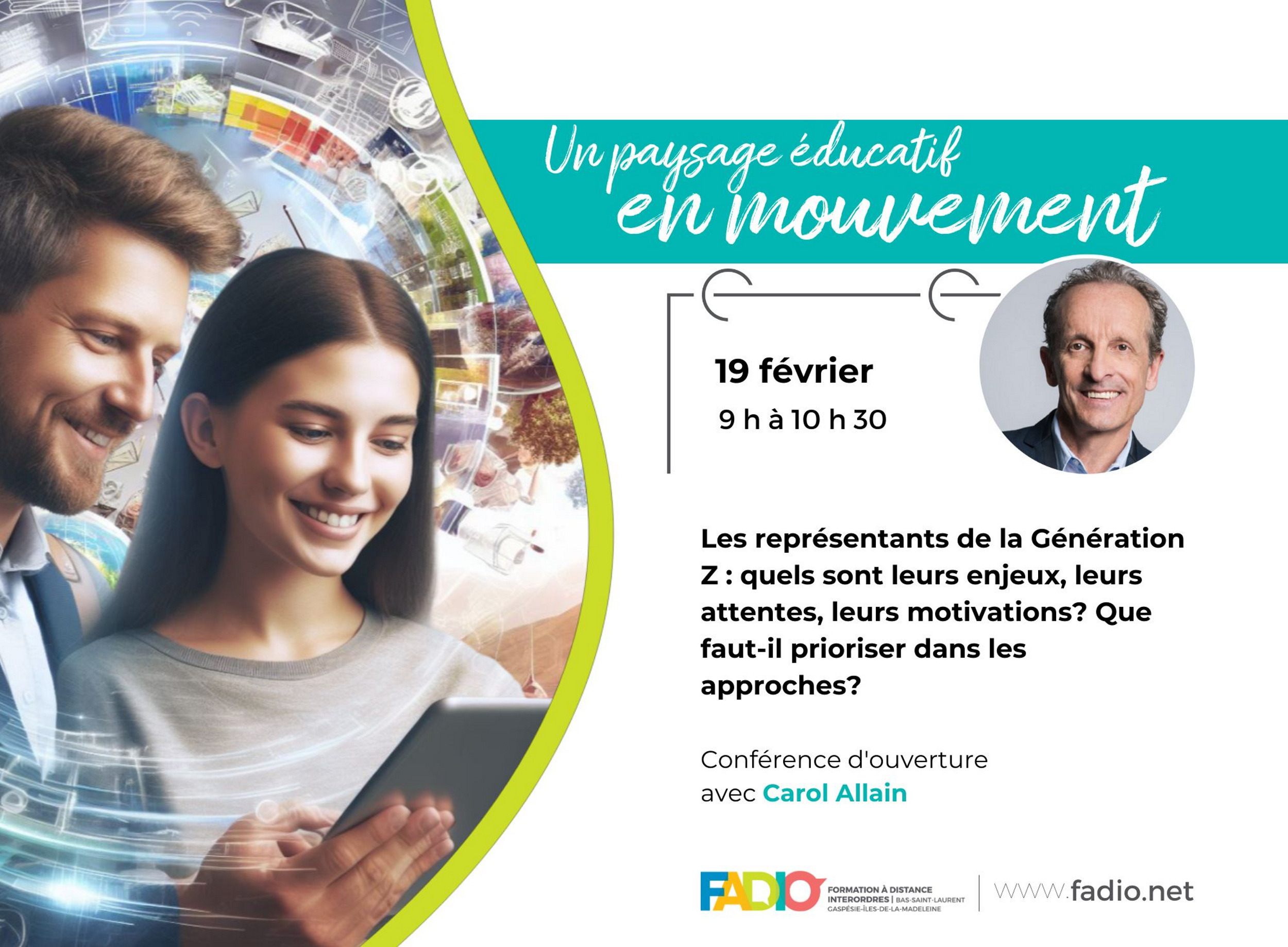 La semaine de la FAD organisée par la FADIO s’est ouverte sur une conférence de Carol Allain, conférencier et formateur à l’international concernant les représentants de la Génération Z: les enjeux, les attentes, les sources de motivation. Je vous propose ici mes réflexions autour de cette conférence.