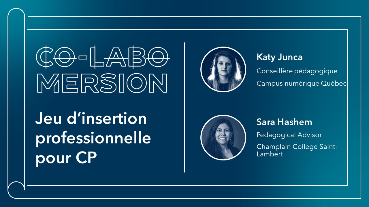 Ainsi, le co-labo-mersion se voulait une étape dans la cocréation d’un outil flexible et adapté aux différents contextes institutionnels, qu’il s’agisse de petits cégeps, de grandes universités ou d’établissements bilingues. Sara et Katy souhaitent que le jeu devienne un support précieux pour :