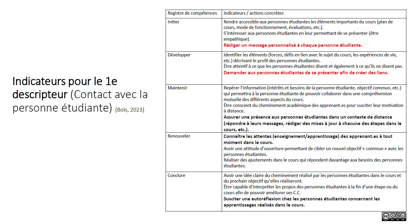 Des actions concrètes, telles que la rédaction de messages personnalisés et la facilitation de présentations étudiantes, sont suggérées pour développer ces compétences. Ainsi, Chantal propose des indicateurs pour chacun des descripteurs.