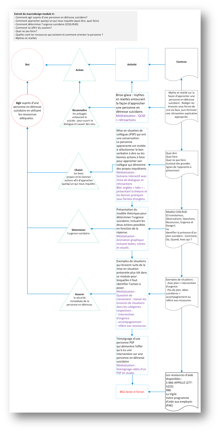 Dans cet exemple, le but devient alors : Agir auprès d’une personne en détresse suicidaire en utilisant les ressources adéquates. Les actions spécifiques sont identifiées afin que la personne apprenante puisse réaliser le but en contexte professionnel. Ainsi, elle aura à reconnaitre les préjugés, choisir les bons propos, etc.