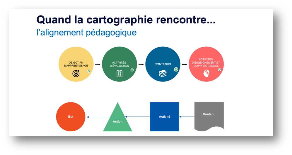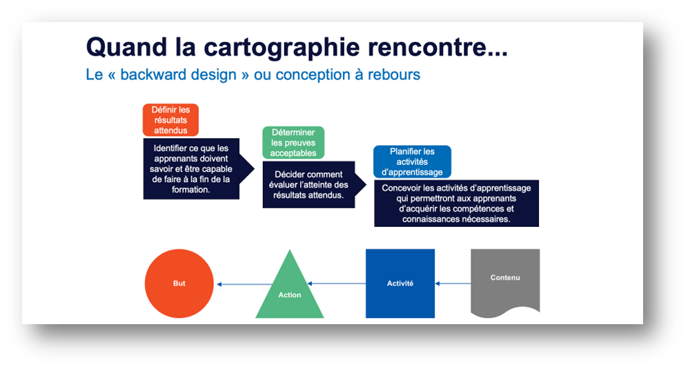 Mais attention, l’idée ici n’est pas de réinventer la roue… c’est plutôt de proposer un outil concret aux experts et expertes de contenu en ayant en tête nos cadres de référence. La cartographie s’harmonise particulièrement bien avec d’autres approches reconnues comme la conception à rebours, c’est-à-dire le « backward design » et l’alignement pédagogique.