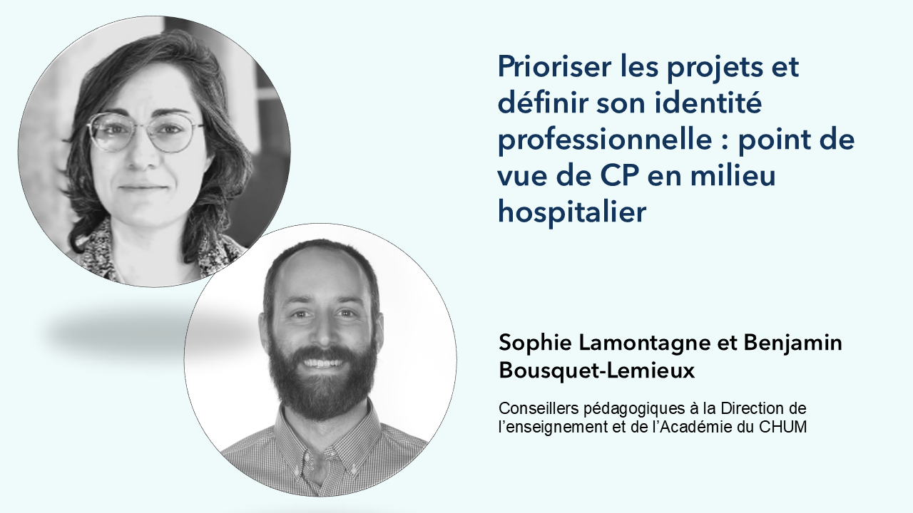 Les CP y jouent un rôle de conseiller, d’accompagnateur, d’innovateur, de facilitateur ou de solutionneur. Benjamin Bousquet-Lemieux et Sophie Lamontagne, tous les deux travaillant à la Direction de l’enseignement et de l’Académie du CHUM (DEAC), sont venus à i-mersion CP présenter l’atelier Prioriser les projets et définir sa posture professionnelle : point de vue de CP en milieu hospitalier.