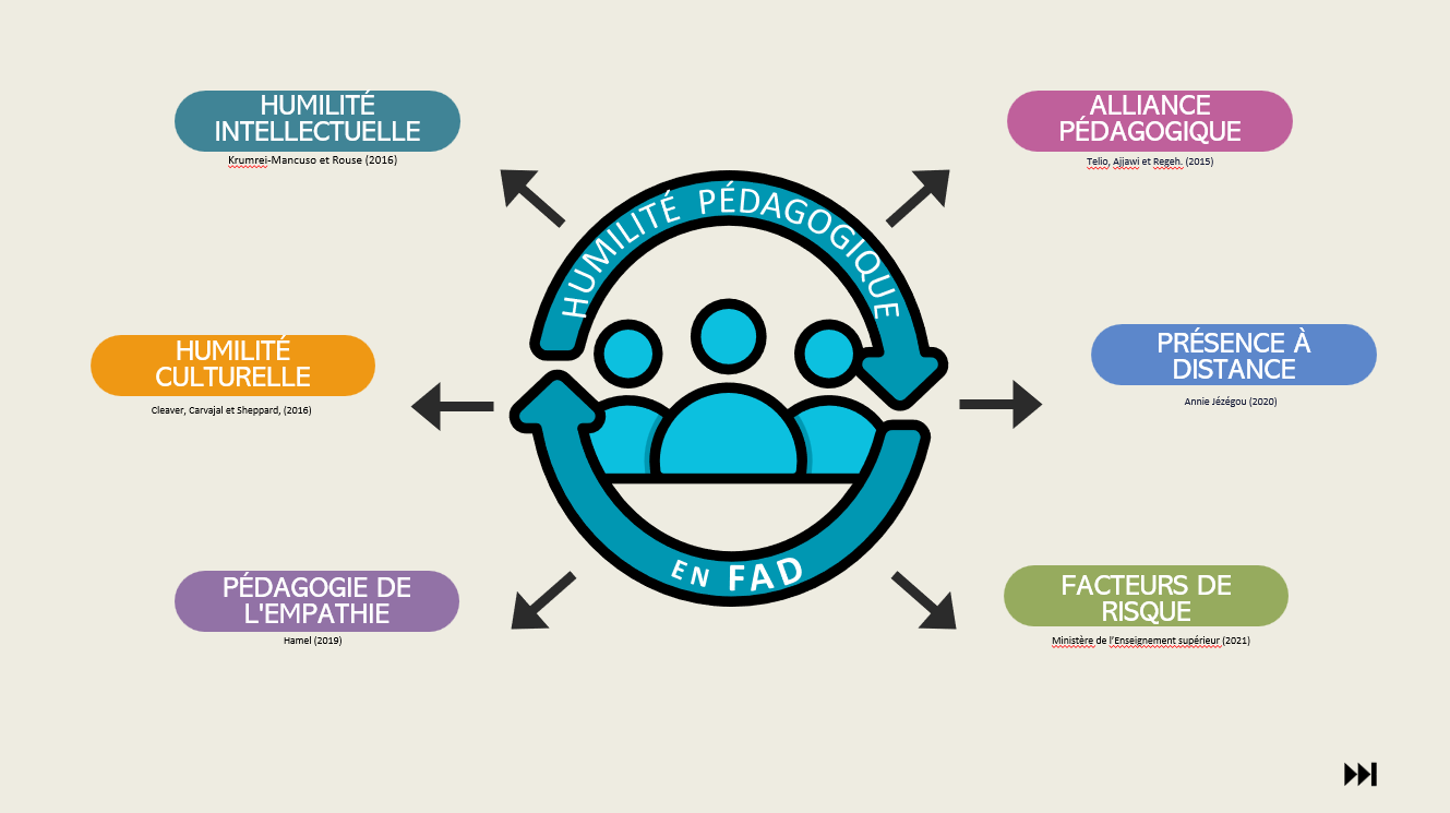 L’humilité pédagogique émerge comme un concept clé pour créer des environnements d’apprentissage plus inclusifs et engageants. Ici, Annie parle de formation à distance (FAD), mais je crois que ça s’applique par uniquement à la FAD… à vous de voir! En conseil pédagogique, je retiens certainement que l’humilité pédagogique raisonne avec des relations humaines positives et empathiques, mais également une valorisation de l’expérience et des compétences des personnes accompagnées.