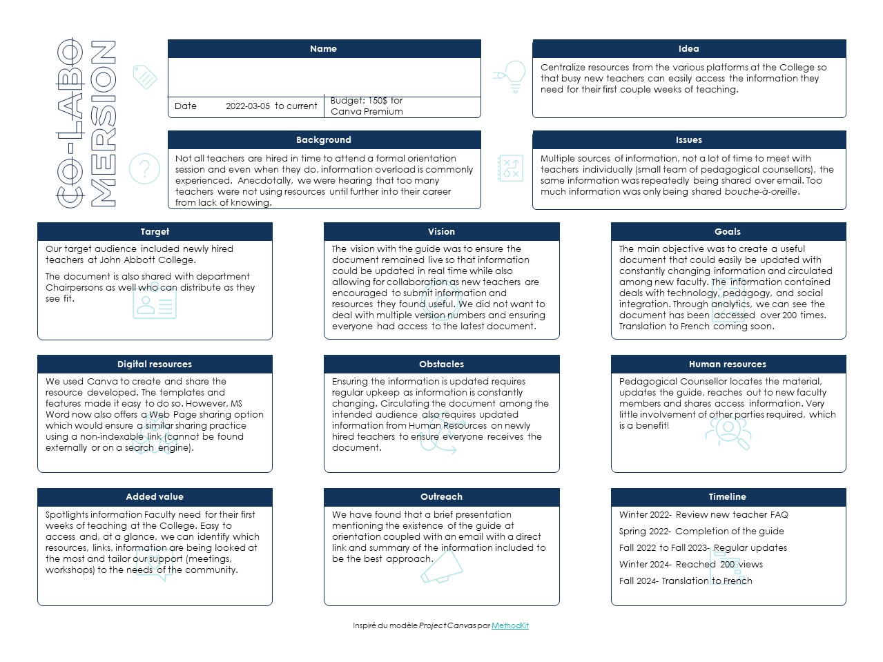 Lors de l’événement, Amanda a eu la générosité de partager avec les personnes participantes le processus décisionnel de développement et le produit obtenu d’un guide d’accueil destiné à outiller les nouvelles personnes enseignantes du collège. Ce guide a pour objectif de faciliter l’appropriation physique, logistique et pédagogique des personnes enseignantes à leur nouvel environnement.